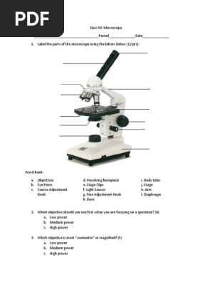 PDF Label compound microscope worksheet Label compound microscope worksheet Name_____. In paragraph 15, when you concentrating the sample, you should always start with the goal of _____ 16. Only the _____ button should be used when using a high-power target. 17. The type of microscope used in most science classes is the _____ microscope. PDF Labeling microscope parts worksheet Labeling microscope parts worksheet Parts of microscope labeling worksheet. An activity could be useful a pencil of different colors for each part of the speech and underline it in old magazines or periodes. See if you can find one or two examples for each part of the speech as you locate your category in the puzzle. You can see a more detailed ... PDF Parts of a Microscope Printables - Homeschool Creations Label the parts of the microscope. You can use the word bank below to fill in the blanks or cut and paste the words at the bottom. Microscope Created by Jolanthe @ HomeschoolCreations.net. Parts of a eyepiece arm stageclips nosepiece focusing knobs illuminator stage objective lenses Parts of the Microscope Printables - ThoughtCo Most microscopes used in a classroom setting are compound microscopes. These usually consist of a light source and three to five lenses with a total magnification of 40x to 1000x. The following free printables can help you teach your students the basic parts of a microscope so that they are ready to dive into a world previously unseen.