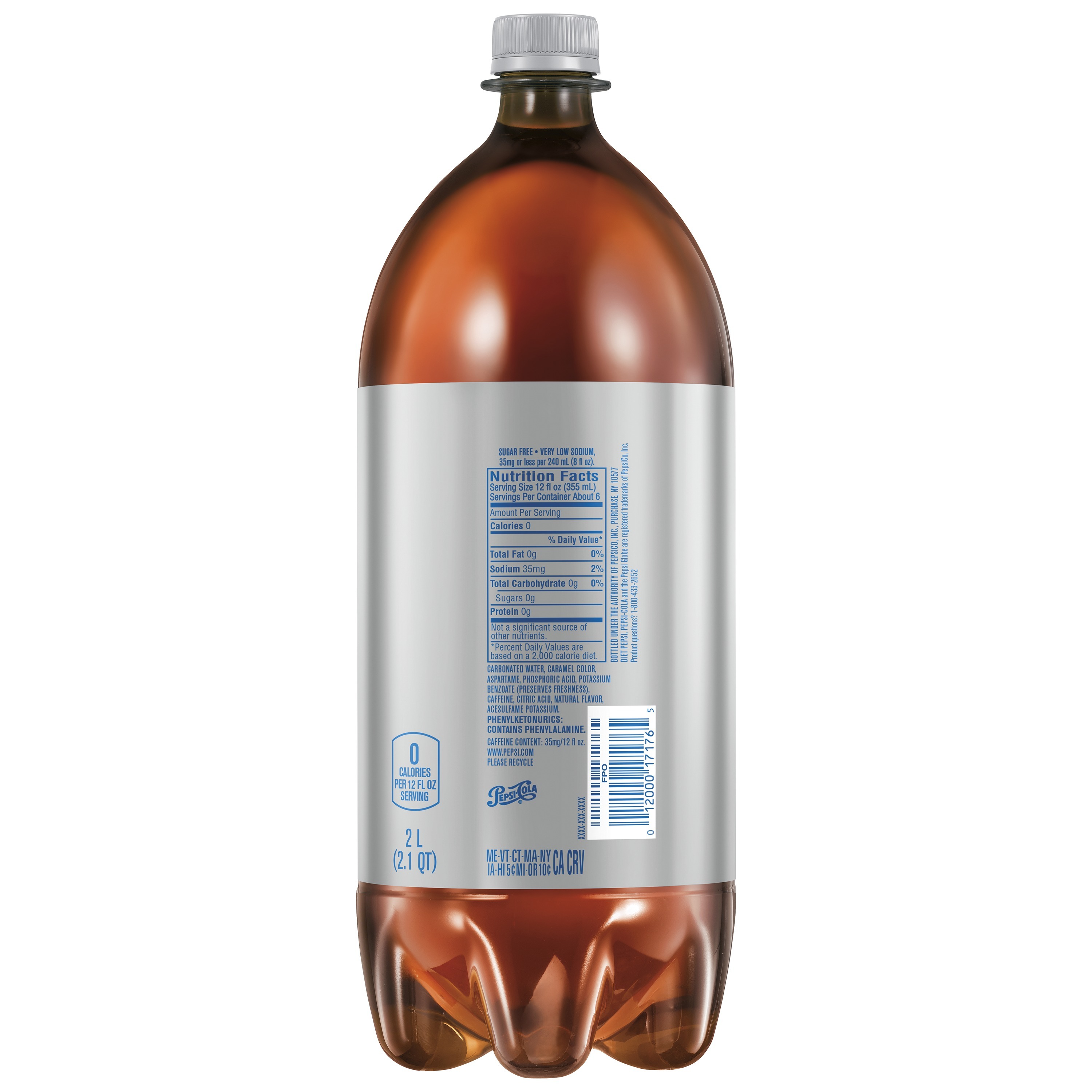 Diet pepsi caffeine free cola 2 liter plastic bottle by PepsiCo Diet pepsi caffeine free cola 2 liter plastic bottle by PepsiCo contains 0 g of saturated fat and 0 mg of cholesterol per serving. 360 g of Diet pepsi caffeine free cola 2 liter plastic bottle by PepsiCo contains 0.0 mg vitamin C as well as 0.00 mg of iron, 0.00 mg of calcium.