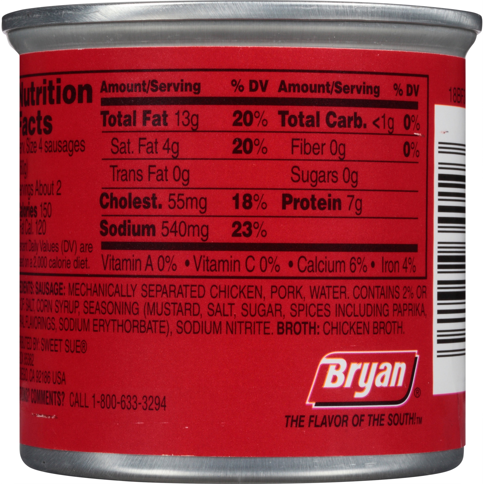 Bryan Vienna Sausage | Casey's Foods Made with chicken- pork added. The flavor of the south. Inspected for wholesomeness by the US Department of Agriculture. Questions? Comments? Call 1-800-633-3294. Aluminum recyclable.