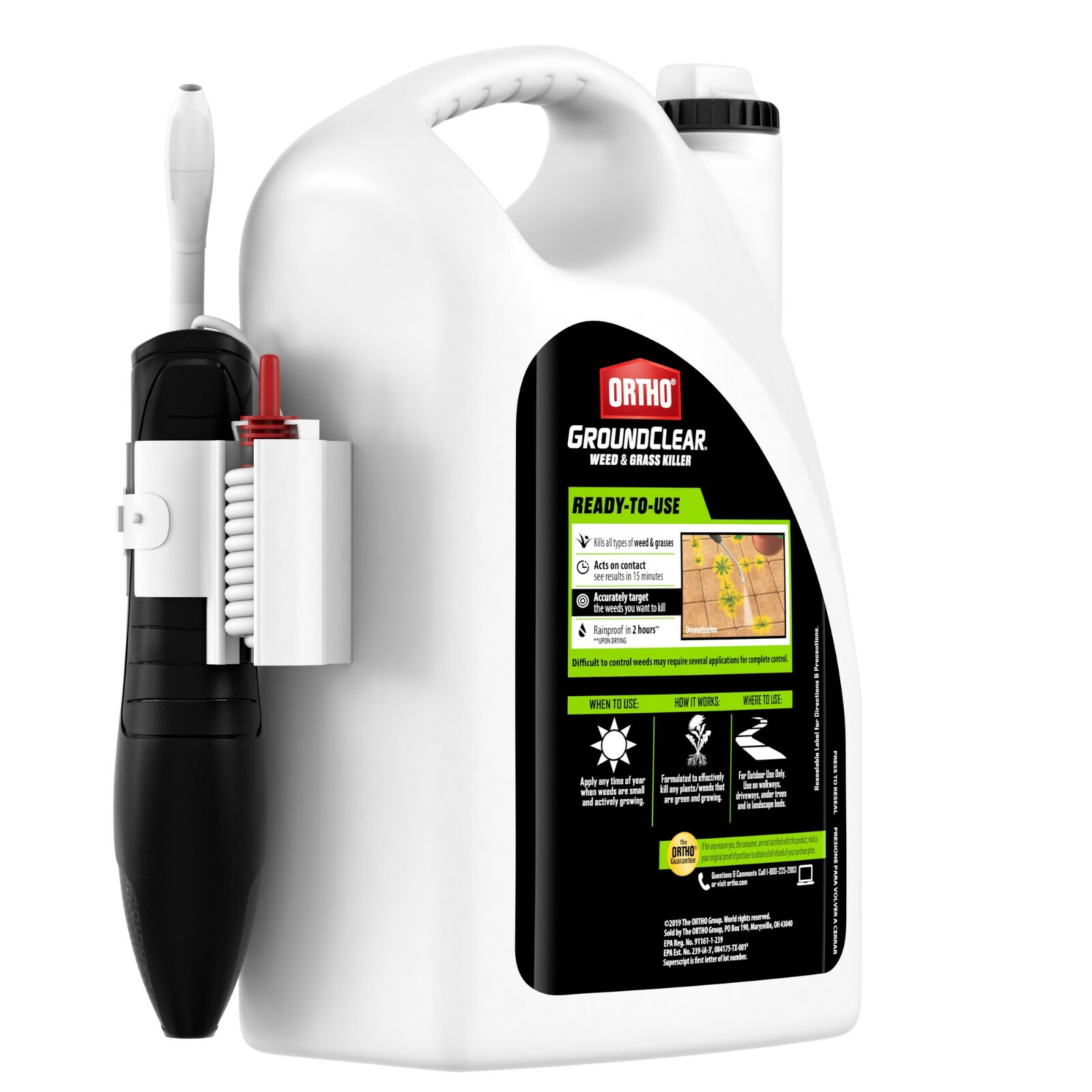 Ortho® GroundClear® Weed & Grass Killer The ready-to-use sprayer makes it easy to accurately target the weeds you want to kill. Use it to kill weeds on hardscapes, in landscape beds, and around vegetable gardens (apply directly to weeds). The fast-acting spray produces visible results in just 15-minutes. Ortho GroundClear Weed and Grass Killer is OMRI listed.