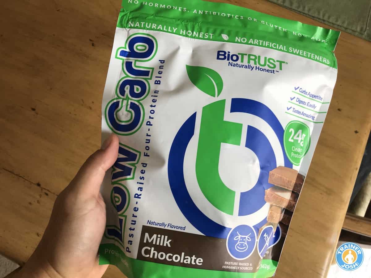 BioTrust Low Carb Protein Powder Review — Worth the Price? BioTrust Low Carb Nutrition Info. I picked up the Chocolate flavor, and a two-scoop serving of BioTrust contains 150 calories: 24 grams of protein, 8 grams of carbs (4 grams of fiber), and 2.5 ...
