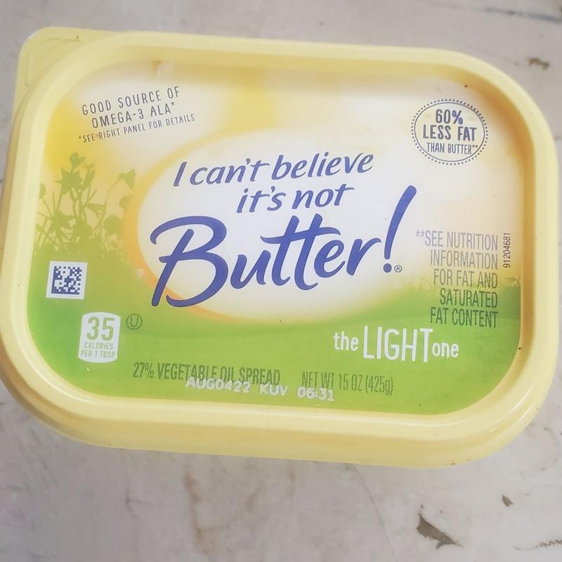 Calories in I Can't Believe It's Not Butter Light Soft Spread Nutrition Facts ; 0 g · 0 mg · 0 mg. Nutrition Facts for I Can't Believe It's Not Butter! Light Spread ... View calories, net carbs, added sugars, sodium, protein, total carbohydrates, fats, vitamins, minerals, and more! I Can't Believe It's Not Butter! Light Spread - H-E-B I Can't Believe It's Not Butter! Light Spread ; Monounsaturated Fat, 1g ; Sodium, 85mg, 4% ; Total Carbohydrate, 0g, 0% ; Protein, 0g ...