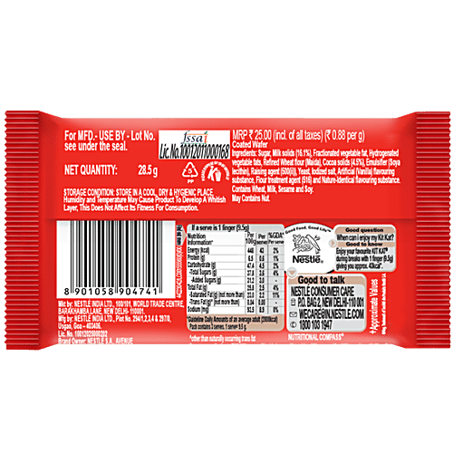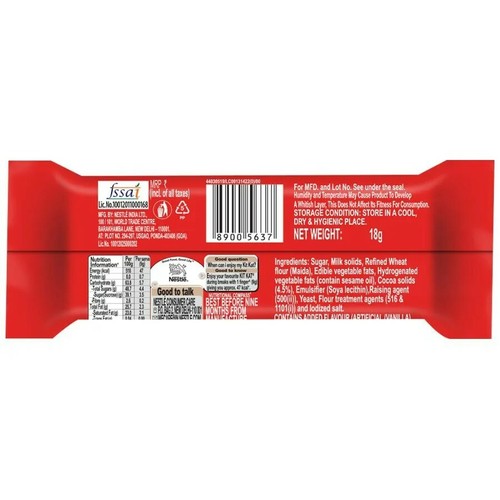 KitKat chocolate brand | Nestlé Global From classic fingers to chunky, original to peanut butter, there is a KitKat for everyone. In Japan alone, flavors include wasabi and sake - while the gift of a KitKat is customary for students sitting their exams. The country's KitKat Chocolatory even lets you design your own dream KitKat. KIT KAT® - Crisp Wafer Bar in Milk Chocolate - SmartLabel™ KIT KAT® - Crisp Wafer Bar in Milk Chocolate - SmartLabel™. KIT KAT®. Crisp Wafer Bar in Milk Chocolate. net wt. 3.92 oz. 00034000087884. Nutrition. Ingredients. Allergens. Features. Kit Kat nutrition facts and analysis. Kit Kat contains 7.7 g of saturated fat and 4.7 mg of cholesterol per serving. 43 g of Kit Kat contains 10.32 mcg vitamin A, 0.0 mg vitamin C, 0.00 mcg vitamin D as well as 0.43 mg of iron, 53.75 mg of calcium, 99 mg of potassium. Kit Kat belong to 'Candy containing chocolate' food category. KitKat - Kit Kat - 1.5 OZ (42 g) Ingredients, allergens, additives, nutrition facts, labels, origin of ingredients and information on product KitKat - Kit Kat - 1.5 OZ (42 g)