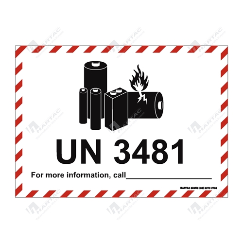 UN3481 Shipping Label | HCL Label Description. UN3481 Shipping Label - Affix this label to the outside of your package or box. Lithium-Ion Batteries contained in equipment or packed with equipment. There is a space for additional information, like a contact phone number. This label uses graphics to clearly illustrate the nature of the package. Share your knowledge of this product.